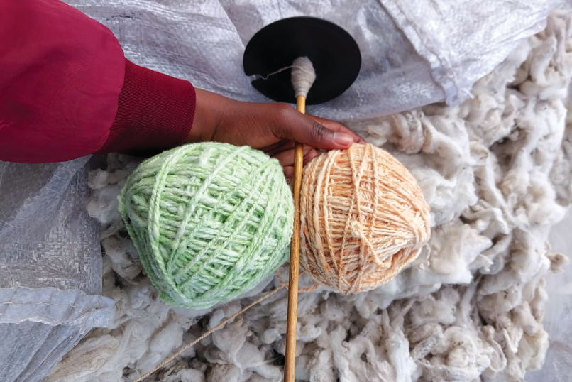The mohair is first washed using ordinary liquid soap and left to dry naturally. Once dry, the wool is brushed to stretch and soften it. Using handmade tools known locally as mankalanyane, the wool is then spun and rolled into yarn by hand.